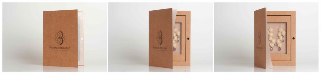 Il est fabriqué en petite série en Wallonie et écologique (pas de mousse, chlore, peu de colle). Un système de différentes calles internes permet d’y présenter des bijoux même de petite taille.
