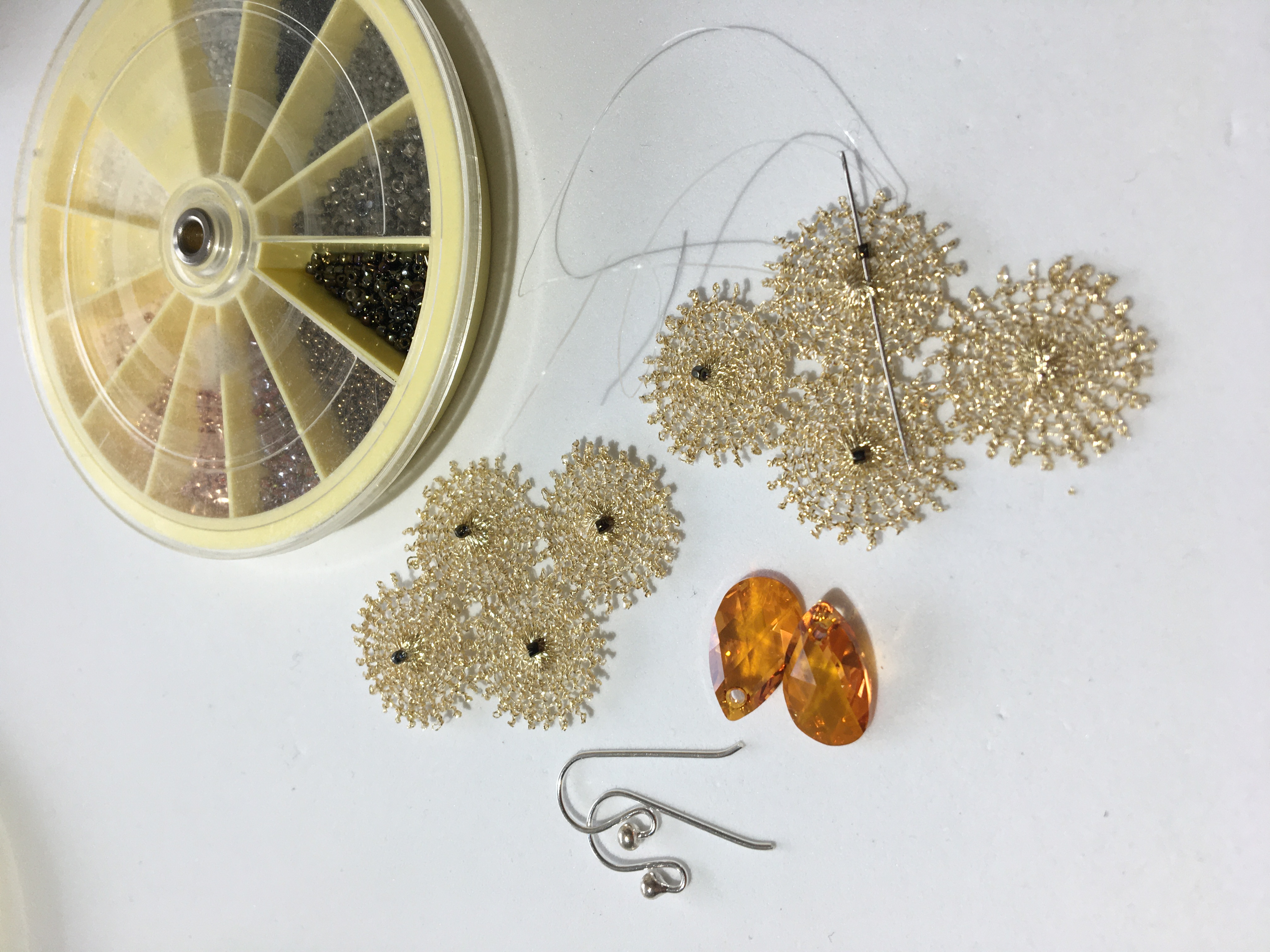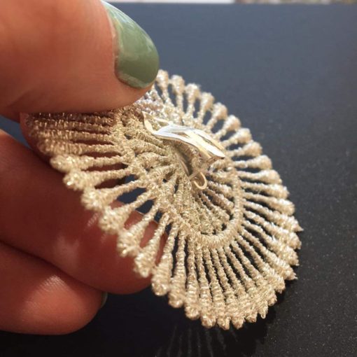 Je fais confectionner les rosaces de dentelle au départ de ce fil de lurex par un atelier italien spécialisé en la matière depuis 1913. Le design est reproduit sur un entrelac de fils (âme) qui sert de base et qui ensuite est fondu par la chaleur. Au départ de ma collection, il y a eu un long travail de recherche pour trouver ce fournisseur d’excellence. Quand je reçois les rosaces, je les associe avec une aiguille et du fil de nylon, parfois je les brode, et je compose de cette manière le design final du bijou. C’est donc une création qui nécessite des étapes multiples.