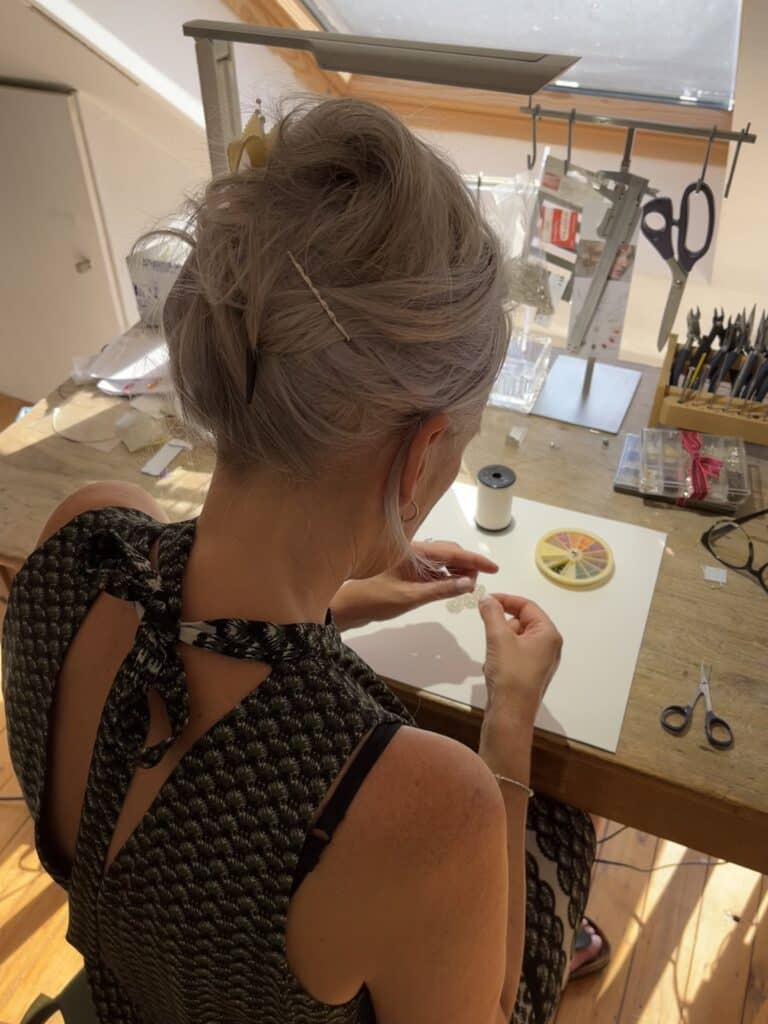 Confection de boucles d’oreille GALAXIE de la collection ASTRES, étape de broderie des micro-rocailles.